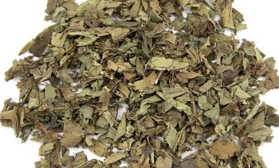 叶多卷曲皱缩,完整者展平后呈长椭圆形至椭圆状披针形,长 10-24cm,宽 5-10cm,先端渐尖,基部楔形或钝圆,边缘有锯齿,上面灰绿色或棕绿色,有短柔毛,下面有灰白色茸毛,两面可见不甚明显的棕黄色腺点;叶柄长 1-2cm,密生灰白色柔毛。气微,味微苦、涩。