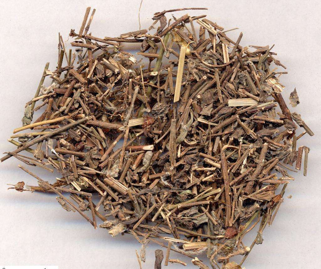 草长 60~90cm,茎圆柱形,直径 2-4mm,通常弯折;表面棕黄色或棕绿色,被白色毛茸,具细纵悛;质硬而脆,易折断,折断面纤维性,黄白色,中央具白色而疏松的髓、叶互生,通常干枯皱缩或脱落,展开后,完整叶片呈长卵圆形,长 6~10cm,宽 3-4cm,叶缘有锯齿,上面棕绿色,下面灰绿色,密被白毛;叶柄短。质脆易破碎或脱落。头状花序集成穗状圆锥花序,枯黄色。气芳香,味淡。