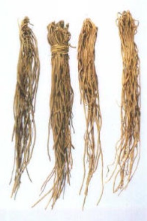 根茎粗短,有结节,多弯曲。上面有圆形的茎痕,下面及两侧簇生多数细长的根。根长 10~25cm,直径 0.1~0.2cm。表面棕黄色。断面皮部黄白色,木部黄色。