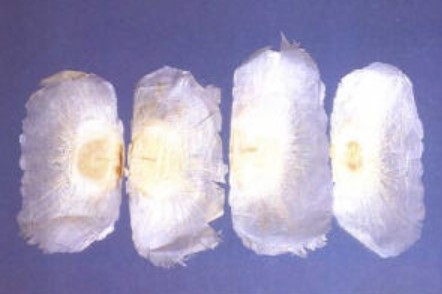为蝶形薄片,种皮除基部外三面延长成宽大菲薄的翅。长 5~8cmm,宽 3.5~4.5cm。表面浅黄白色,翅半透明,有绢丝样光泽,上有放射状纹理,边缘多破裂。体轻、剥去种皮,可见一层薄膜状的胚乳紧裹于子叶之外。子叶 2,蝶形,黄绿色或黄色,长径 1~1.5cm。