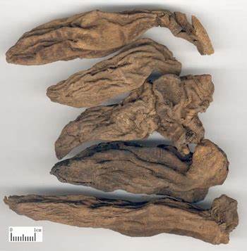 药材:呈类圆柱形,中部略粗或上粗下细,有的微弯曲。表面灰黄色或灰褐色、横长皮孔样突起及稀疏的横裂纹和须根痕。质坚实,不易折断,断面黑色,微有光泽。