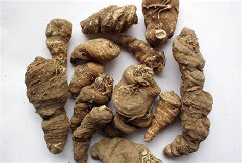 呈结节状扁圆柱形,略弯曲。密具层状突起的粗环纹,一面结节明显,结节上具椭圆形凹陷茎痕,另一面有疏生的须根或疣状须根痕。顶端具鳞叶和茎的残基。质坚实,断面平坦,白色至浅棕色,粉性或角质样。气微,味微苦、麻。