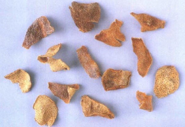 橘红 #【性味归经】 #辛 苦 温肺 脾【功效】 #行气宽中 燥湿化痰 发表散寒【主治】 #湿痰咳嗽,痰多胸闷。风寒咳嗽。湿阻中焦。【其他】 #【来源】 #为芸香科植物橘及其栽培变种的干燥外层果皮。【性状鉴别】 #呈长条形或不规则薄片状,边缘皱缩向内卷曲。外表面黄棕色或橙红色,存放后呈棕褐色,密布黄白色突起或凹下的油室。内表面黄白色,密布凹下透光小圆点。质脆易碎。