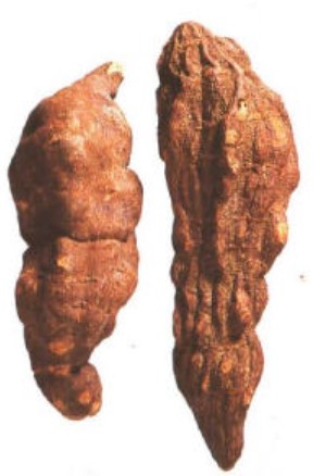 呈团块状或纺锤形。表面红棕色或红褐色,皱缩不平,有浅沟,并有横长皮孔样突起及细根痕。切断面浅黄棕色或浅红棕色,显粉性,皮部散有 4~11 个类圆形异形维管束环列(